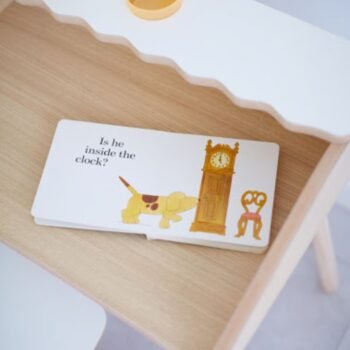 Construido en melamina combinado con blanco. Pequeño banquito con gracioas orejas de conejo como respaldo