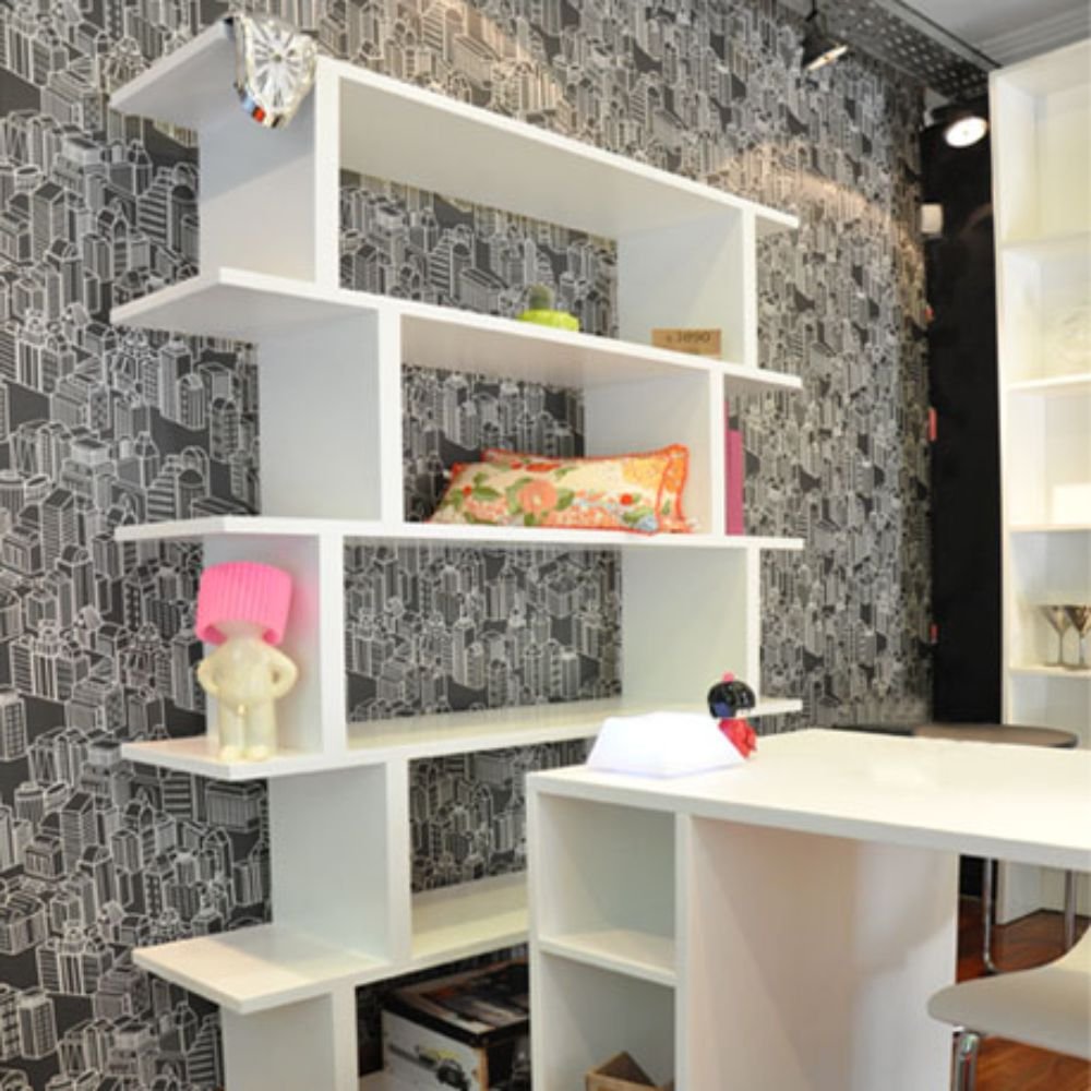 Biblioteca de diseño con estantes y terminación de laca poliuretánica blanca antiamarilleo. Se le pueden agregar puertas en cualquier estante. Es ideal para separar un ambiente pequeño.